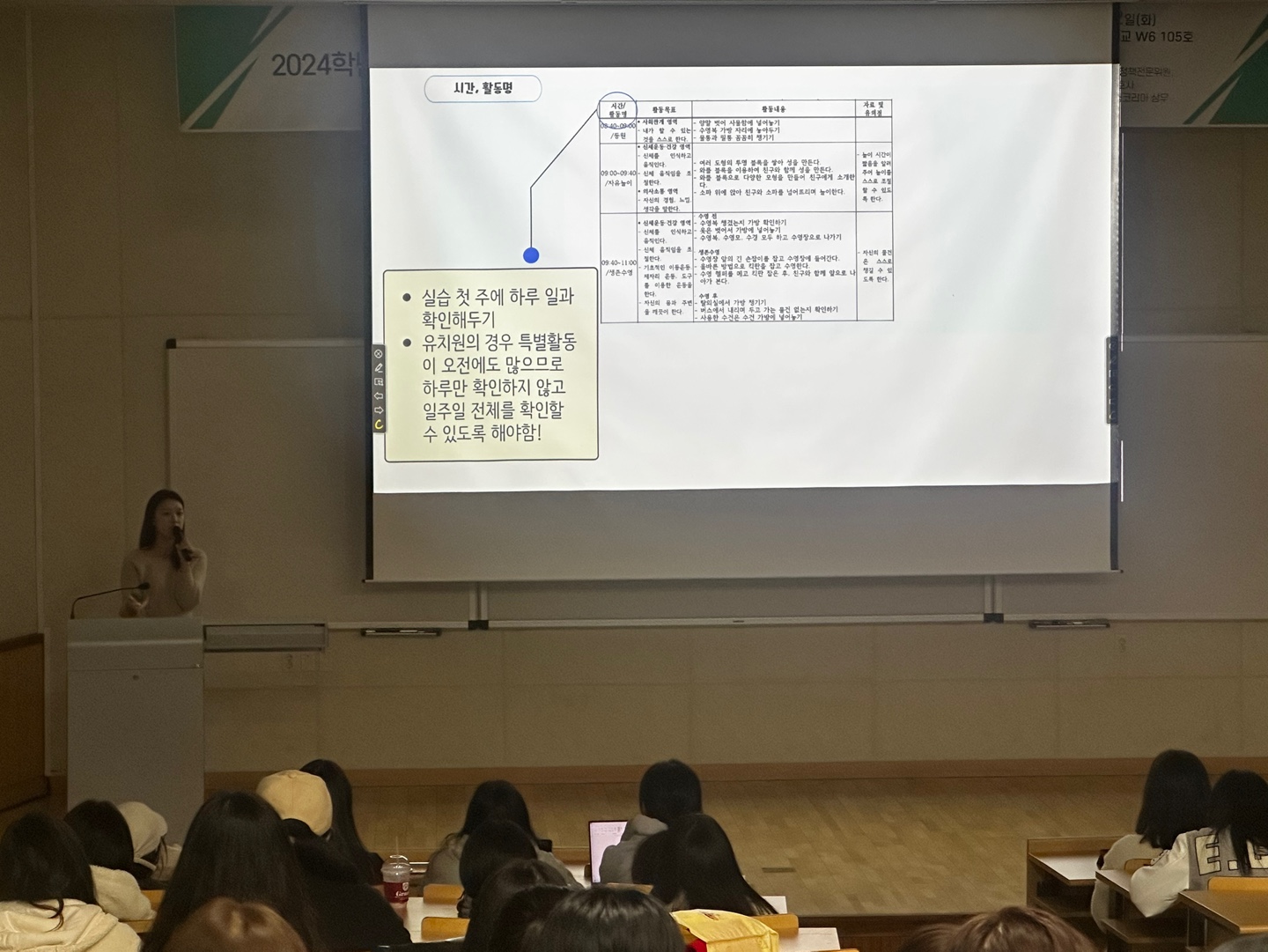 유아교육과에서는 25학년도 학교현장실습, 보육실습에 대비하여 3,4학년 재학생들의 실습후기 특강이 진행되었습니다.