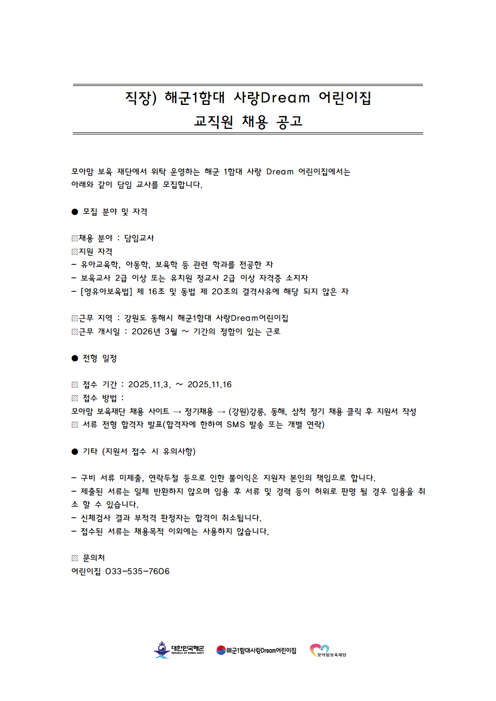 해군1함대 사랑Dream 어린이집 교직원 채용