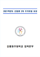 2026학년도 추가모집요강 1차 추가 원서접수 : 2026.2.20.(금)10:00~2.25(수)10:00까지 2차 추가 원서접수 : 2026.2.25.(수)16:00~2.26.(목)14:00까지 접수방법 : 인터넷 원서접수 * 3차 추가모집은 1차 및 2차 추가모집 미충원 시 실시 예정 바로보기 다운로드 Kangwon National University 2026 Kangwon National University 2025 2025학년도 신입생 1차 추가모집 요강 바로보기 다운로드 Kangwon National University 2024 2024학년도 신입생 1차 추가모집 요강 바로보기 다운로드 Kangwon National University 2023 2023학년도 신입생 1차 추가모집 요강 바로보기 다운로드 Kangwon National University 2022 2022학년도 신입생 1차 추가모집 요강 바로보기 다운로드 Kangwon National University 2021 2021학년도 신입생 1차 추가모집 요강 바로보기 다운로드 Kangwon National University 2021 2021학년도 신입생 2차 추가모집 요강 바로보기 다운로드 Kangwon National University 2021 2021학년도 신입생 3차 추가모집 요강 바로보기 다운로드
